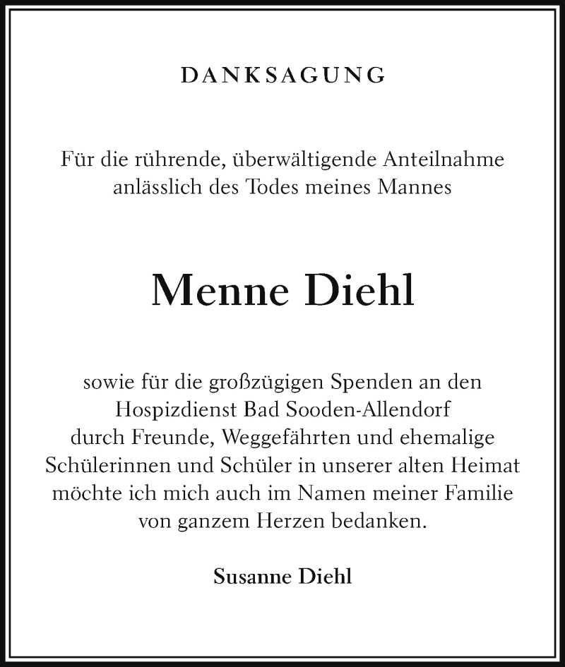 Hier finden Sie alle Traueranzeigen aus der Zeitung, die bisher für Menne Diehl erschienen sind. Weitere Traueranzeigen, die in der Zeitung erscheinen, werden hier ebenfalls aufgelistet