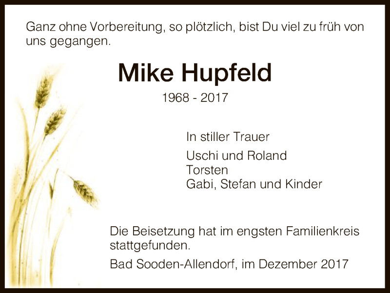 Hier finden Sie alle Traueranzeigen aus der Zeitung, die bisher für Mike Hupfeld erschienen sind. Weitere Traueranzeigen, die in der Zeitung erscheinen, werden hier ebenfalls aufgelistet