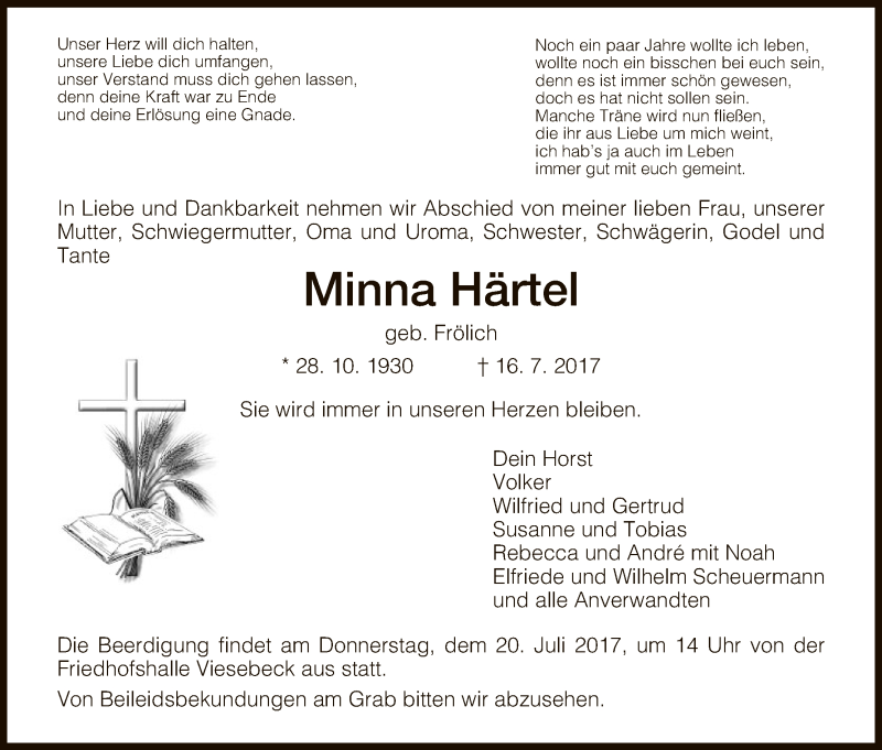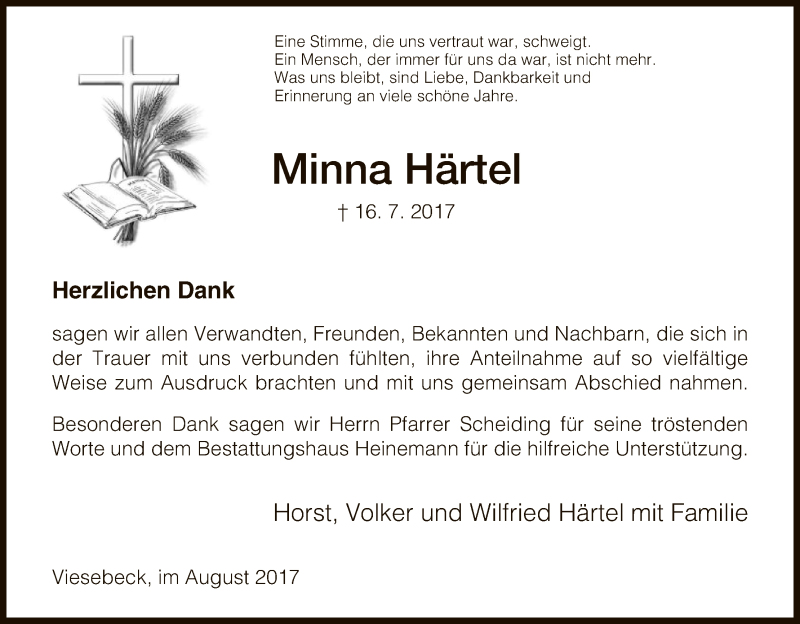 Hier finden Sie alle Traueranzeigen aus der Zeitung, die bisher für Minna Härtel erschienen sind. Weitere Traueranzeigen, die in der Zeitung erscheinen, werden hier ebenfalls aufgelistet