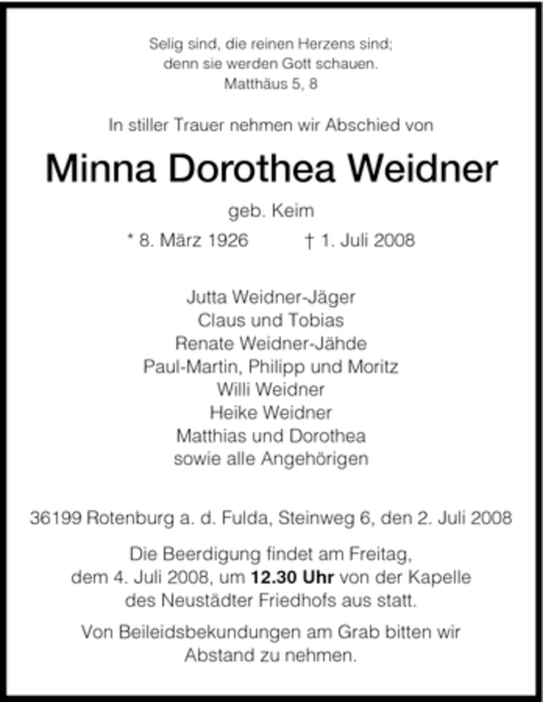 Hier finden Sie alle Traueranzeigen aus der Zeitung, die bisher für Minna Dorothea Weidner erschienen sind. Weitere Traueranzeigen, die in der Zeitung erscheinen, werden hier ebenfalls aufgelistet