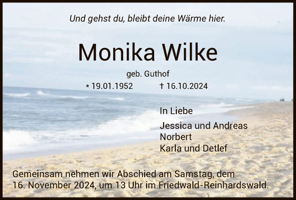 Hier finden Sie alle Traueranzeigen aus der Zeitung, die bisher für Monika Wilke erschienen sind. Weitere Traueranzeigen, die in der Zeitung erscheinen, werden hier ebenfalls aufgelistet