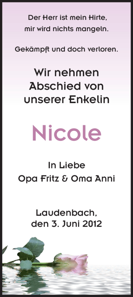 Hier finden Sie alle Traueranzeigen aus der Zeitung, die bisher für Nicole Unbekannt erschienen sind. Weitere Traueranzeigen, die in der Zeitung erscheinen, werden hier ebenfalls aufgelistet
