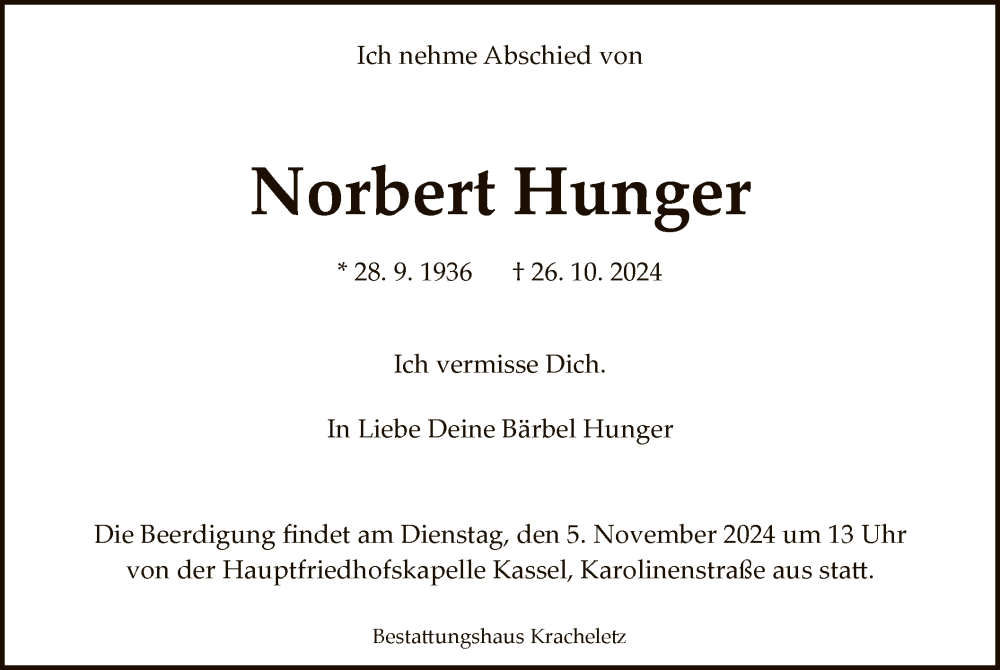 Hier finden Sie alle Traueranzeigen aus der Zeitung, die bisher für Norbert Hunger erschienen sind. Weitere Traueranzeigen, die in der Zeitung erscheinen, werden hier ebenfalls aufgelistet