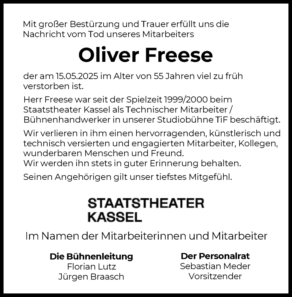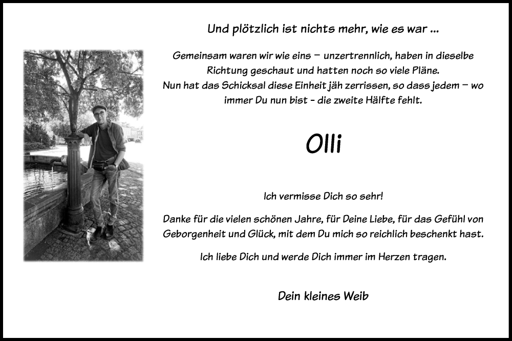 Hier finden Sie alle Traueranzeigen aus der Zeitung, die bisher für Oliver Freese erschienen sind. Weitere Traueranzeigen, die in der Zeitung erscheinen, werden hier ebenfalls aufgelistet