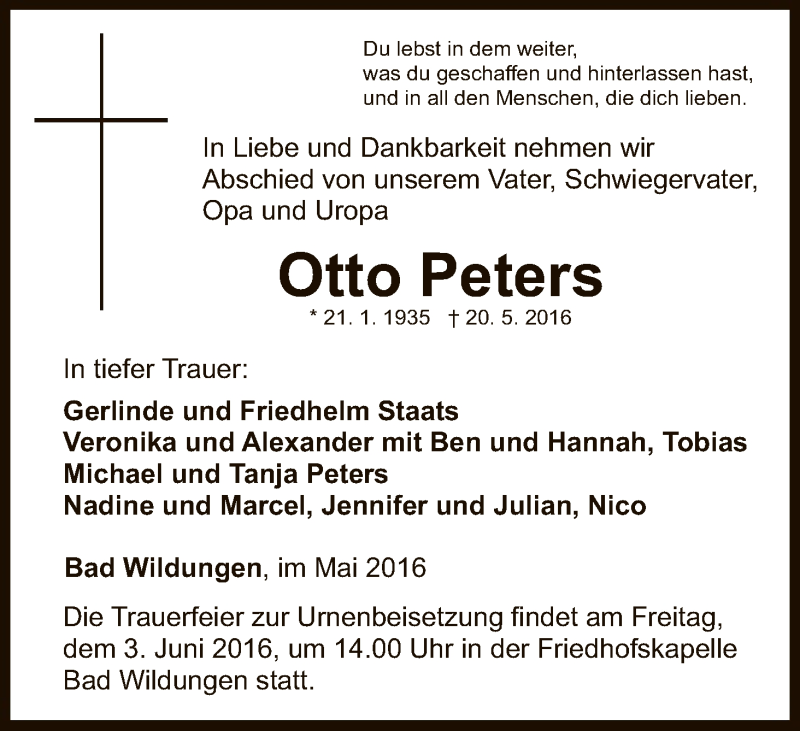 Hier finden Sie alle Traueranzeigen aus der Zeitung, die bisher für Otto Peters erschienen sind. Weitere Traueranzeigen, die in der Zeitung erscheinen, werden hier ebenfalls aufgelistet
