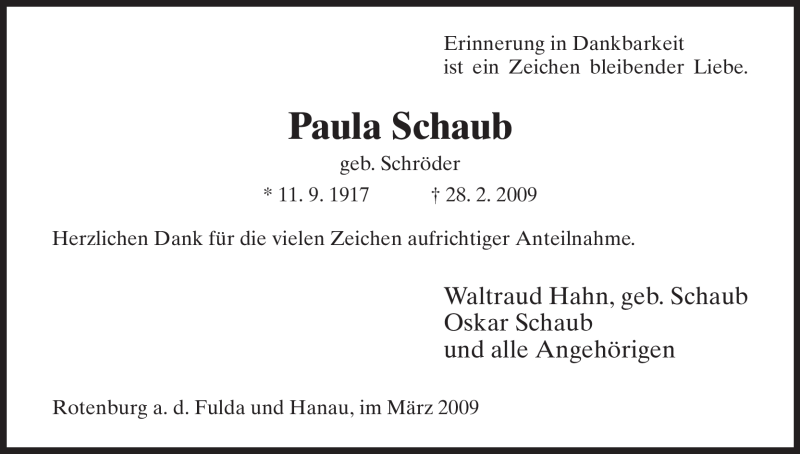 Hier finden Sie alle Traueranzeigen aus der Zeitung, die bisher für Paula Schaub erschienen sind. Weitere Traueranzeigen, die in der Zeitung erscheinen, werden hier ebenfalls aufgelistet