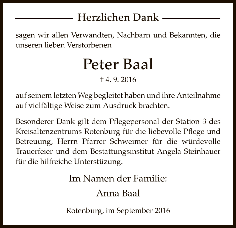 Hier finden Sie alle Traueranzeigen aus der Zeitung, die bisher für Peter Baal erschienen sind. Weitere Traueranzeigen, die in der Zeitung erscheinen, werden hier ebenfalls aufgelistet