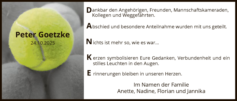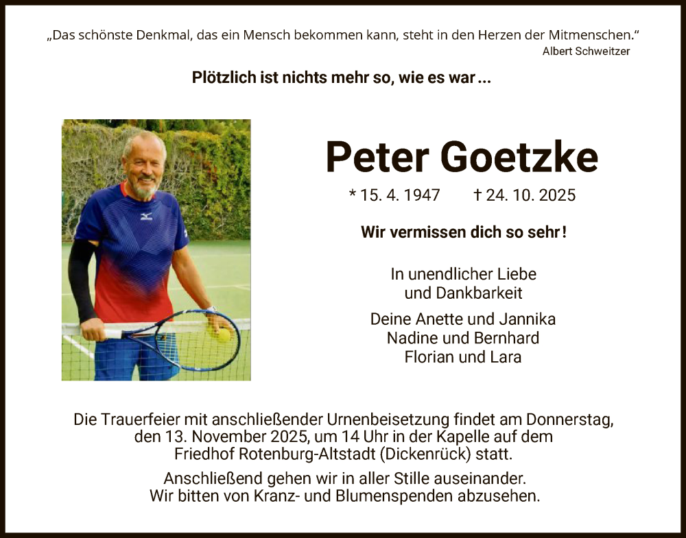 Hier finden Sie alle Traueranzeigen aus der Zeitung, die bisher für Peter Goetzke erschienen sind. Weitere Traueranzeigen, die in der Zeitung erscheinen, werden hier ebenfalls aufgelistet