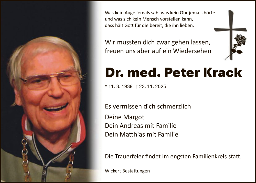 Hier finden Sie alle Traueranzeigen aus der Zeitung, die bisher für Peter Krack erschienen sind. Weitere Traueranzeigen, die in der Zeitung erscheinen, werden hier ebenfalls aufgelistet