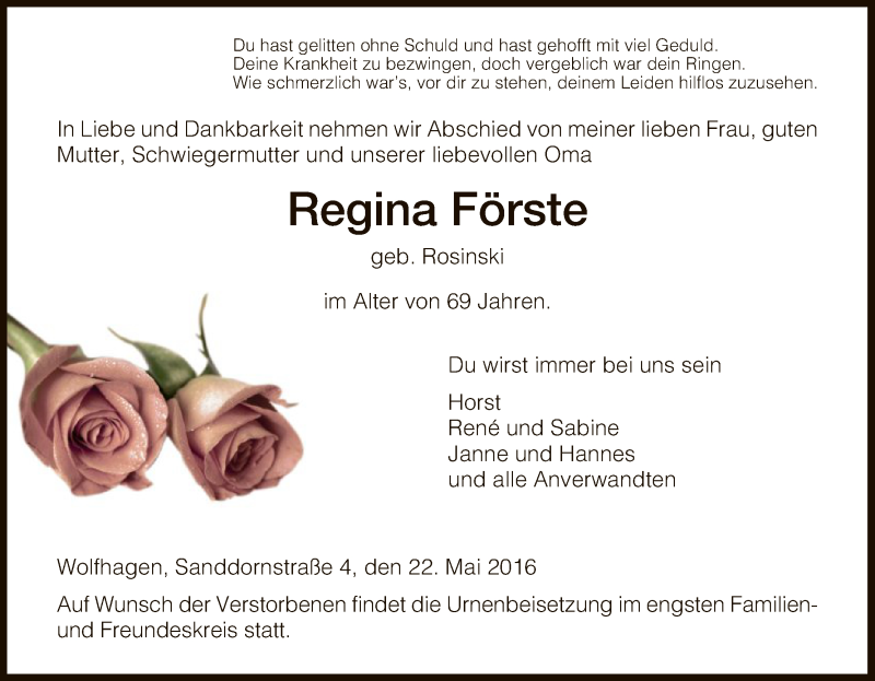 Hier finden Sie alle Traueranzeigen aus der Zeitung, die bisher für Regina Förste erschienen sind. Weitere Traueranzeigen, die in der Zeitung erscheinen, werden hier ebenfalls aufgelistet