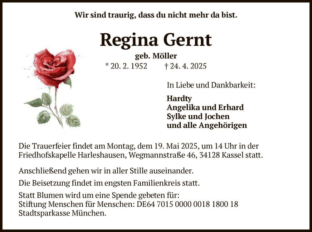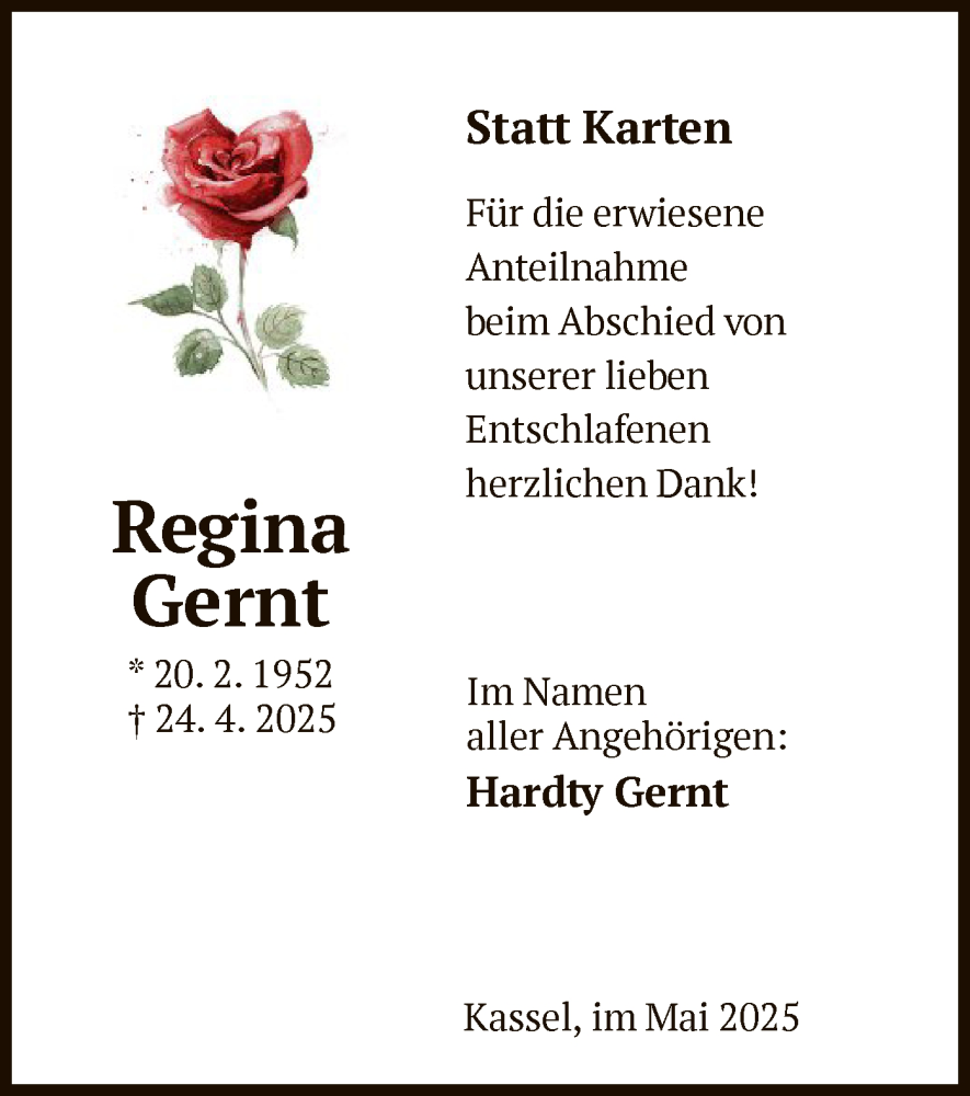 Hier finden Sie alle Traueranzeigen aus der Zeitung, die bisher für Regina Gernt erschienen sind. Weitere Traueranzeigen, die in der Zeitung erscheinen, werden hier ebenfalls aufgelistet