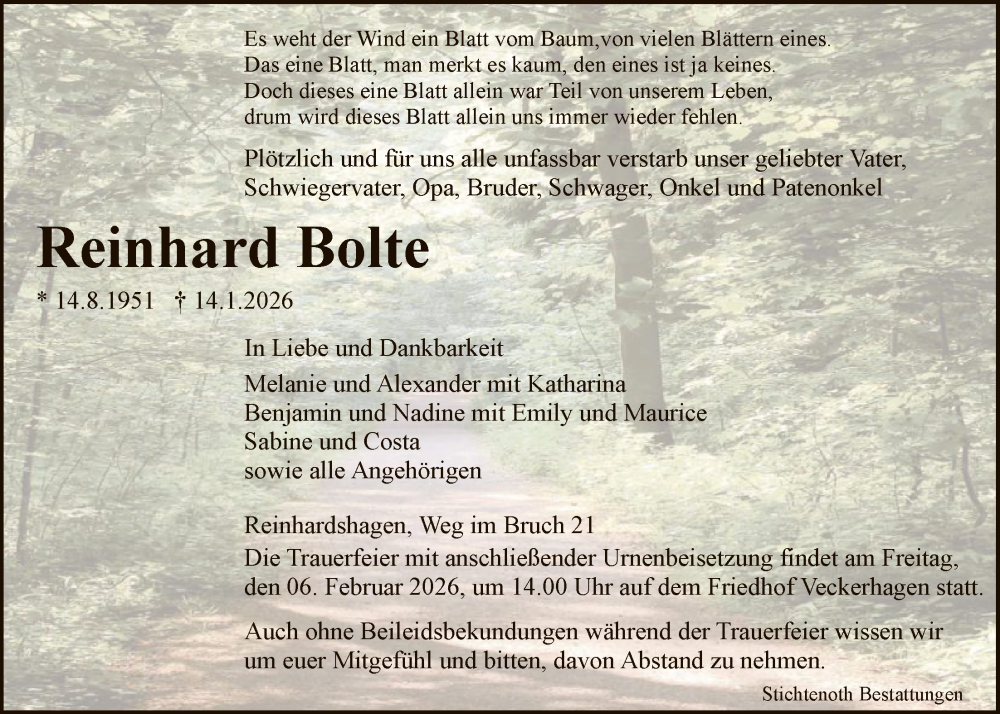 Hier finden Sie alle Traueranzeigen aus der Zeitung, die bisher für Reinhard Bolte erschienen sind. Weitere Traueranzeigen, die in der Zeitung erscheinen, werden hier ebenfalls aufgelistet