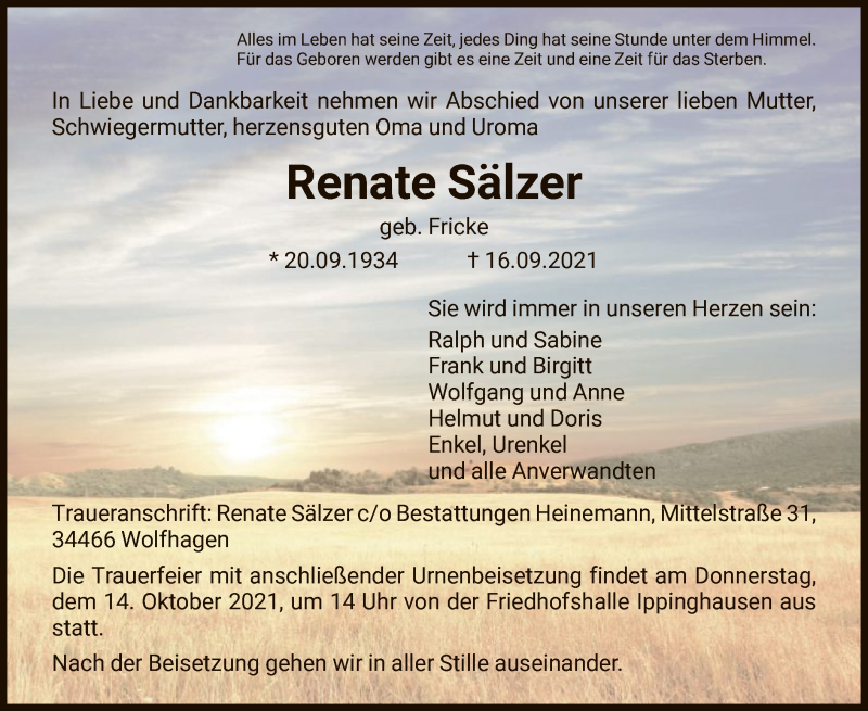 Hier finden Sie alle Traueranzeigen aus der Zeitung, die bisher für Renate Sälzer erschienen sind. Weitere Traueranzeigen, die in der Zeitung erscheinen, werden hier ebenfalls aufgelistet