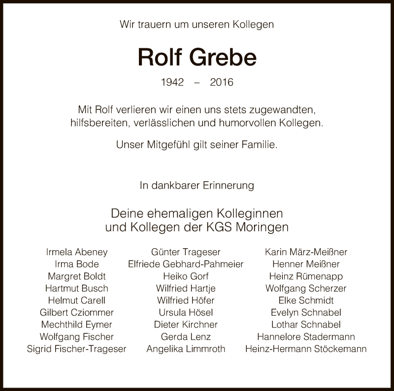 Hier finden Sie alle Traueranzeigen aus der Zeitung, die bisher für Rolf Grebe erschienen sind. Weitere Traueranzeigen, die in der Zeitung erscheinen, werden hier ebenfalls aufgelistet