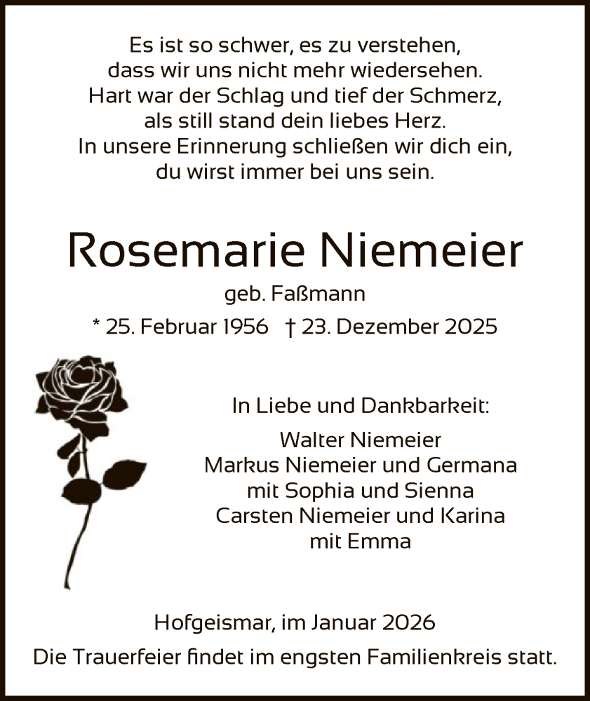 Hier finden Sie alle Traueranzeigen aus der Zeitung, die bisher für Rosemarie Niemeier erschienen sind. Weitere Traueranzeigen, die in der Zeitung erscheinen, werden hier ebenfalls aufgelistet