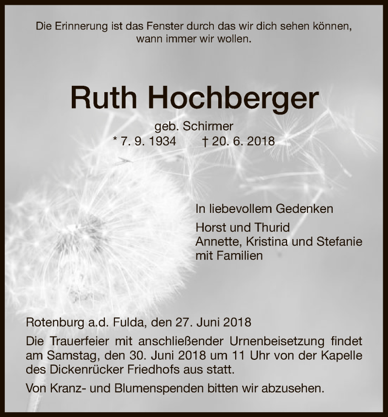 Hier finden Sie alle Traueranzeigen aus der Zeitung, die bisher für Ruth Hochberger erschienen sind. Weitere Traueranzeigen, die in der Zeitung erscheinen, werden hier ebenfalls aufgelistet