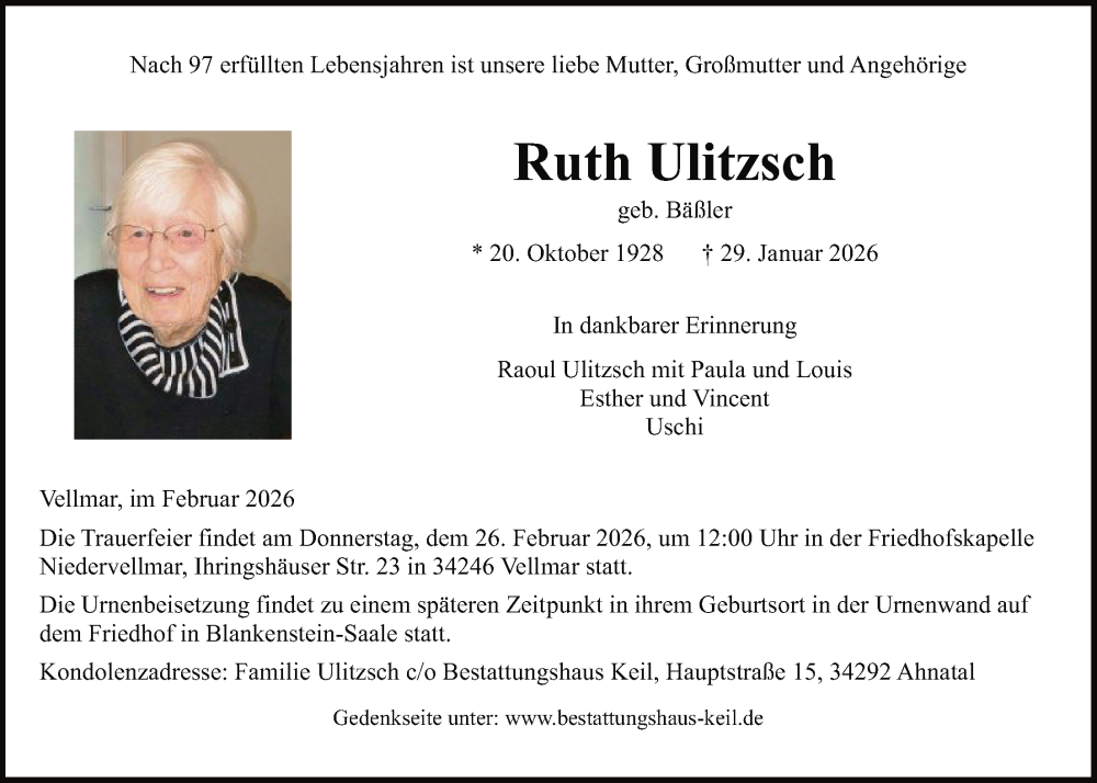 Hier finden Sie alle Traueranzeigen aus der Zeitung, die bisher für Ruth Ulitzsch erschienen sind. Weitere Traueranzeigen, die in der Zeitung erscheinen, werden hier ebenfalls aufgelistet