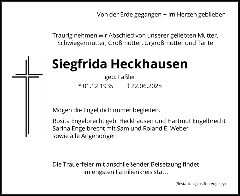 Hier finden Sie alle Traueranzeigen aus der Zeitung, die bisher für Siegfrida Heckhausen erschienen sind. Weitere Traueranzeigen, die in der Zeitung erscheinen, werden hier ebenfalls aufgelistet