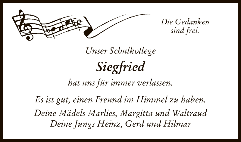 Hier finden Sie alle Traueranzeigen aus der Zeitung, die bisher für Siegfried erschienen sind. Weitere Traueranzeigen, die in der Zeitung erscheinen, werden hier ebenfalls aufgelistet