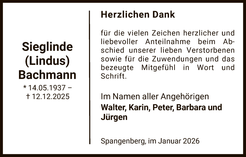 Hier finden Sie alle Traueranzeigen aus der Zeitung, die bisher für Sieglinde Bachmann erschienen sind. Weitere Traueranzeigen, die in der Zeitung erscheinen, werden hier ebenfalls aufgelistet