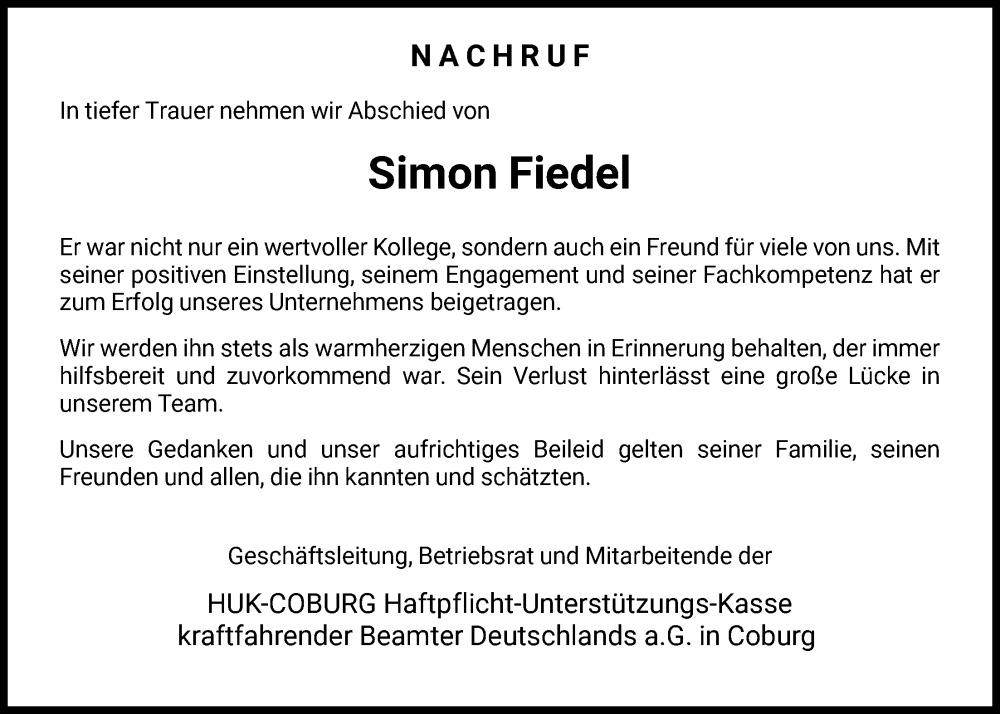 Hier finden Sie alle Traueranzeigen aus der Zeitung, die bisher für Simon Fiedel erschienen sind. Weitere Traueranzeigen, die in der Zeitung erscheinen, werden hier ebenfalls aufgelistet