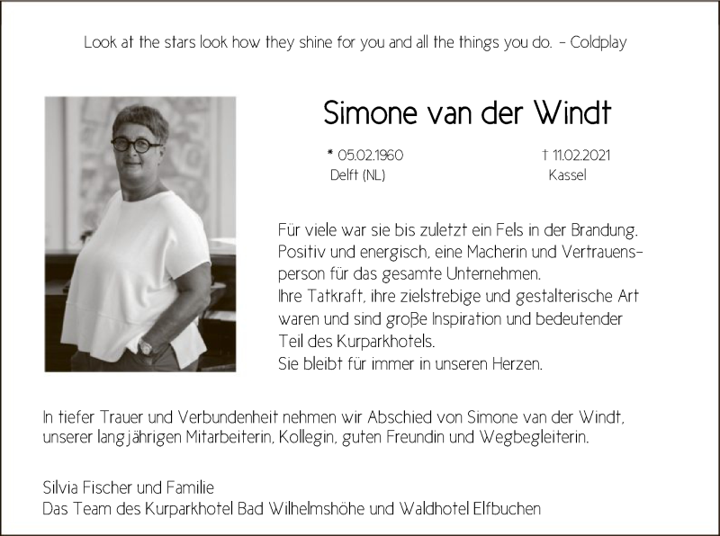 Hier finden Sie alle Traueranzeigen aus der Zeitung, die bisher für Simone van der Windt erschienen sind. Weitere Traueranzeigen, die in der Zeitung erscheinen, werden hier ebenfalls aufgelistet