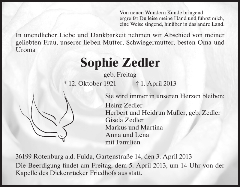 Hier finden Sie alle Traueranzeigen aus der Zeitung, die bisher für Sophie Zedler erschienen sind. Weitere Traueranzeigen, die in der Zeitung erscheinen, werden hier ebenfalls aufgelistet