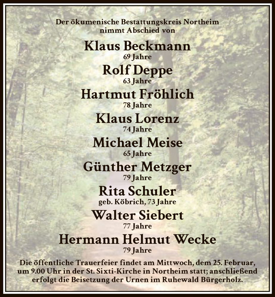 Hier finden Sie alle Traueranzeigen aus der Zeitung, die bisher für Sterbetafel vom 21.02.2026 erschienen sind. Weitere Traueranzeigen, die in der Zeitung erscheinen, werden hier ebenfalls aufgelistet