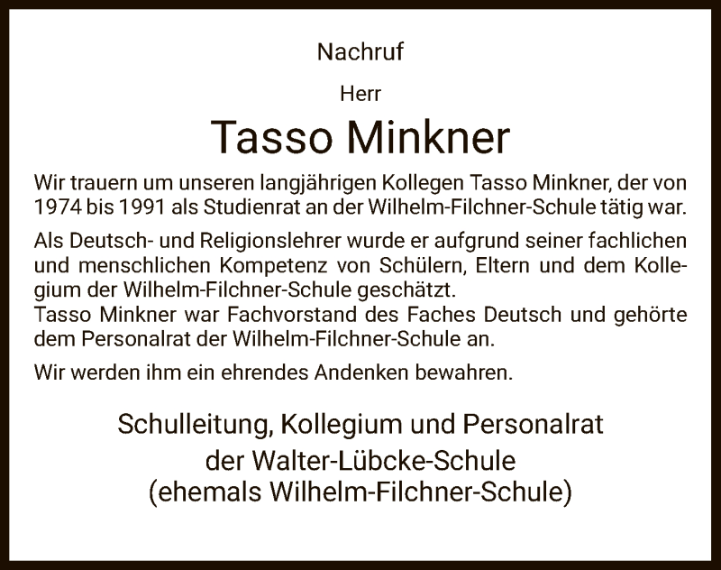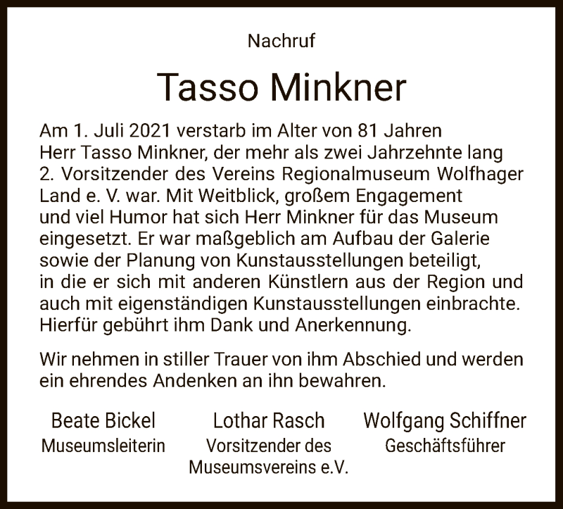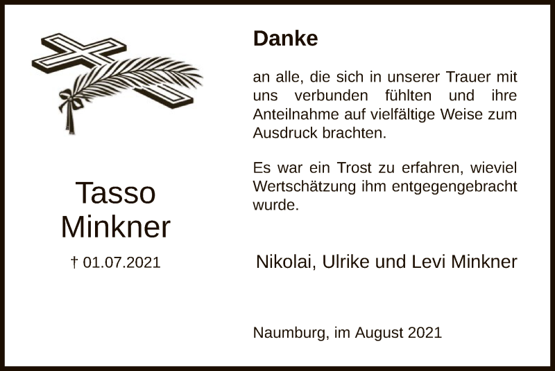 Hier finden Sie alle Traueranzeigen aus der Zeitung, die bisher für Tasso Minkner erschienen sind. Weitere Traueranzeigen, die in der Zeitung erscheinen, werden hier ebenfalls aufgelistet