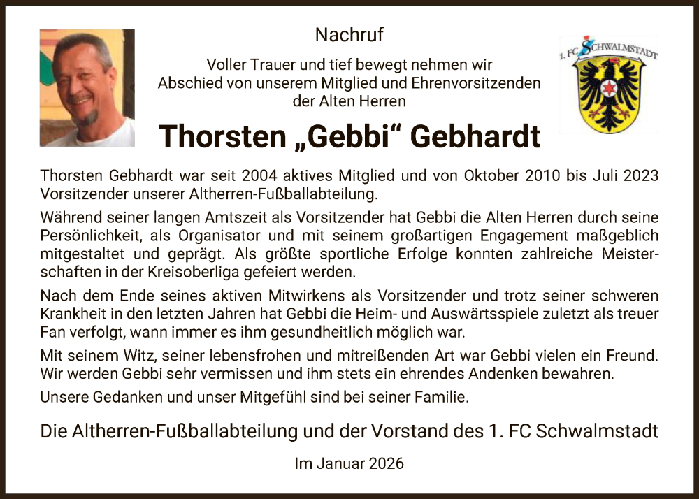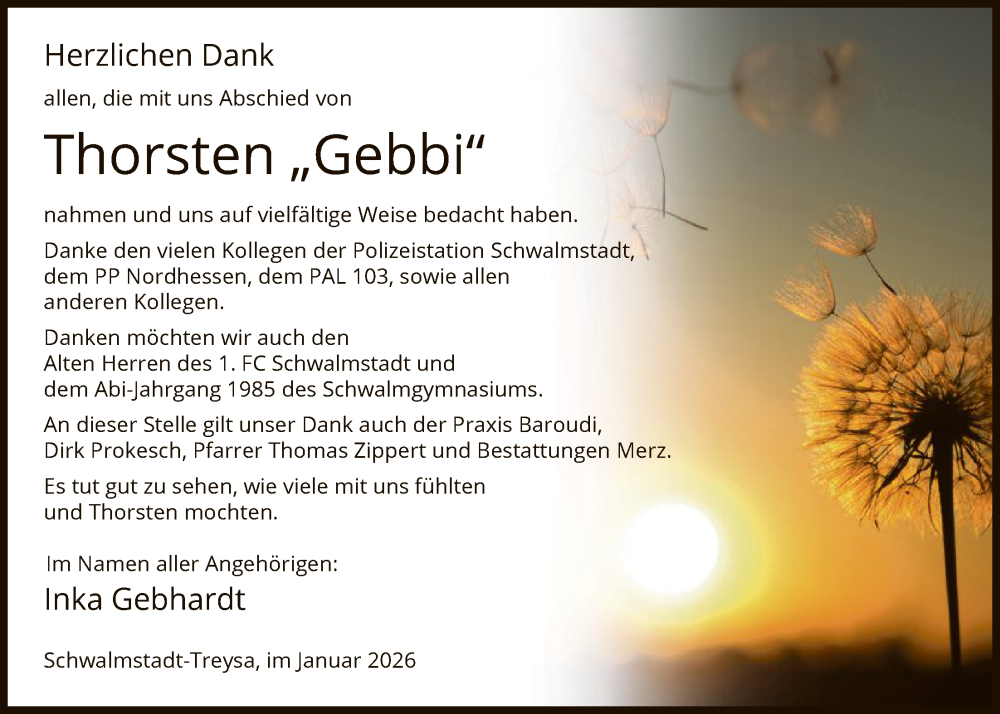 Hier finden Sie alle Traueranzeigen aus der Zeitung, die bisher für Thorsten Gebhardt erschienen sind. Weitere Traueranzeigen, die in der Zeitung erscheinen, werden hier ebenfalls aufgelistet