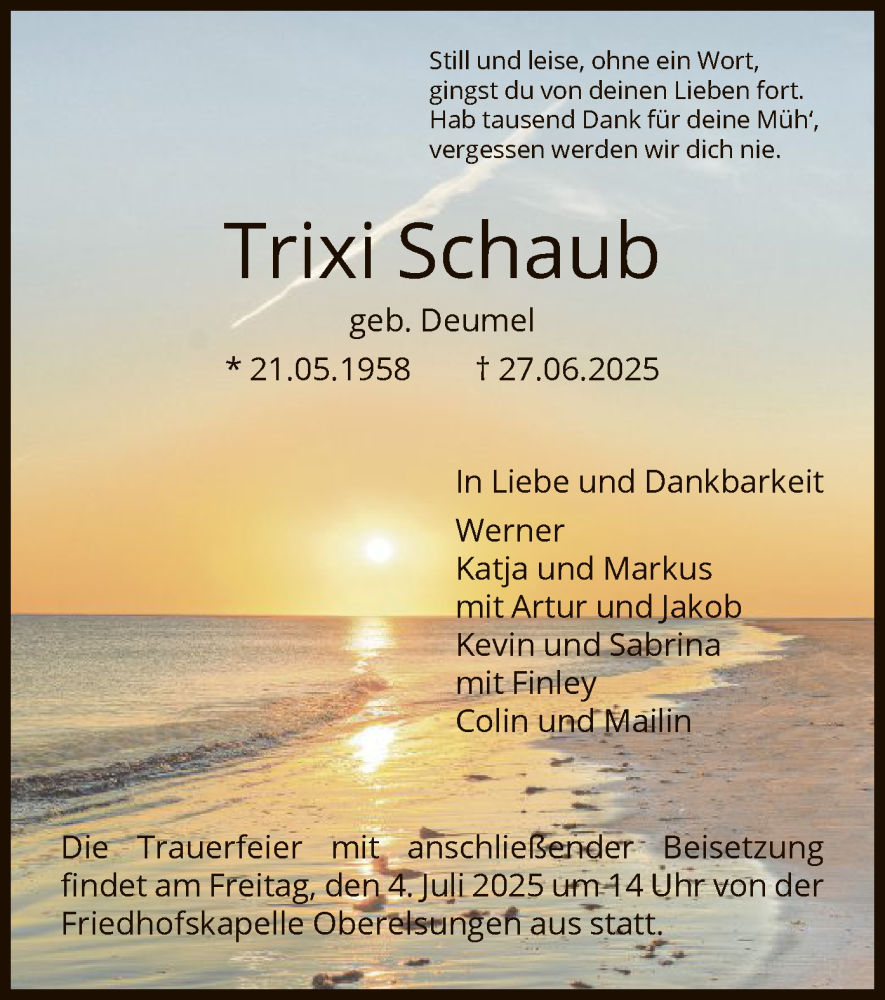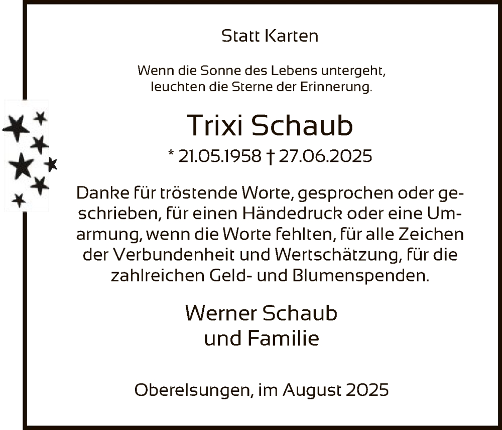 Hier finden Sie alle Traueranzeigen aus der Zeitung, die bisher für Trixi Schaub erschienen sind. Weitere Traueranzeigen, die in der Zeitung erscheinen, werden hier ebenfalls aufgelistet