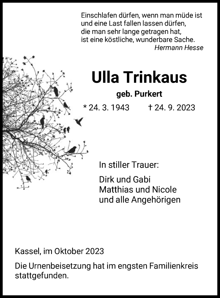 Hier finden Sie alle Traueranzeigen aus der Zeitung, die bisher für Ulla Trinkaus erschienen sind. Weitere Traueranzeigen, die in der Zeitung erscheinen, werden hier ebenfalls aufgelistet