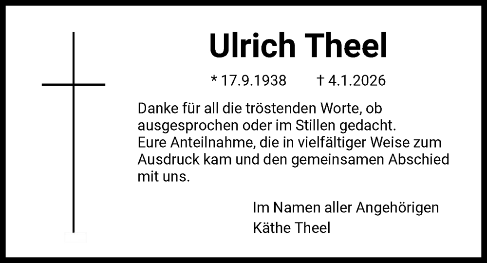 Hier finden Sie alle Traueranzeigen aus der Zeitung, die bisher für Ulrich Theel erschienen sind. Weitere Traueranzeigen, die in der Zeitung erscheinen, werden hier ebenfalls aufgelistet