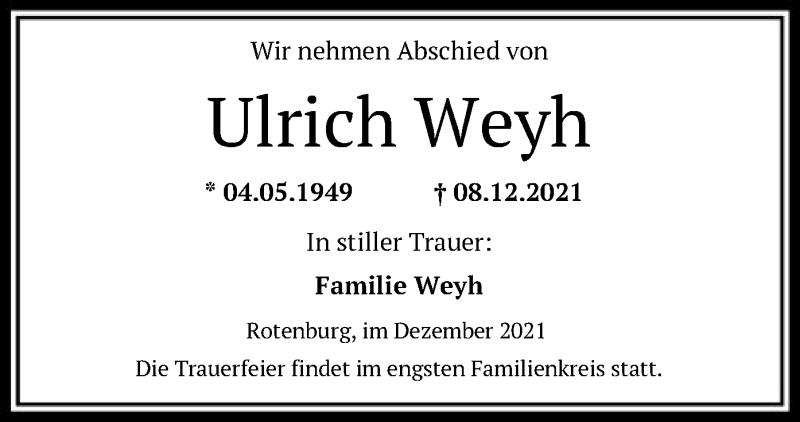 Hier finden Sie alle Traueranzeigen aus der Zeitung, die bisher für Ulrich Weyh erschienen sind. Weitere Traueranzeigen, die in der Zeitung erscheinen, werden hier ebenfalls aufgelistet