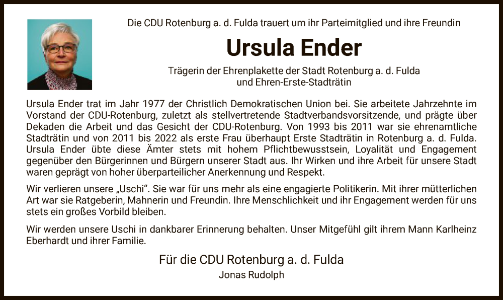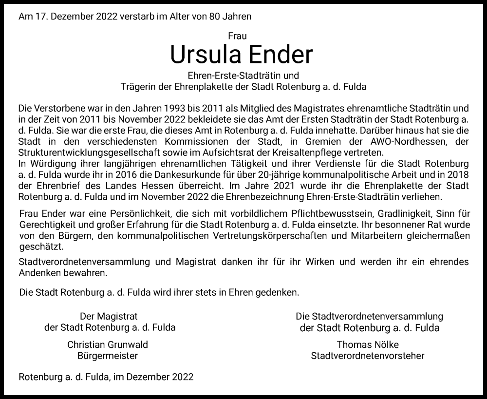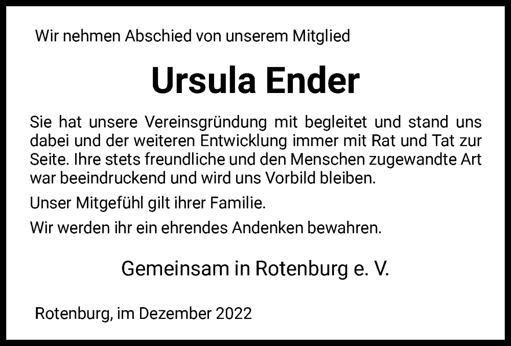 Hier finden Sie alle Traueranzeigen aus der Zeitung, die bisher für Ursula Ender erschienen sind. Weitere Traueranzeigen, die in der Zeitung erscheinen, werden hier ebenfalls aufgelistet
