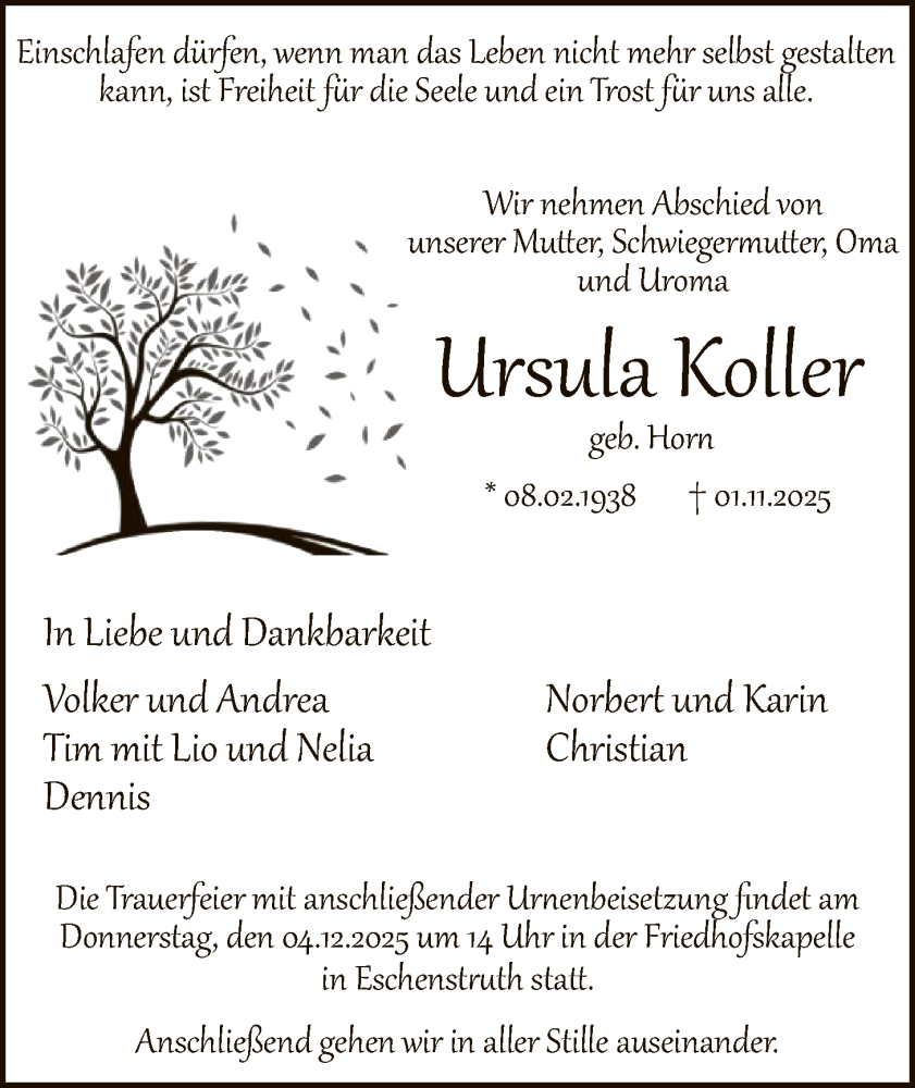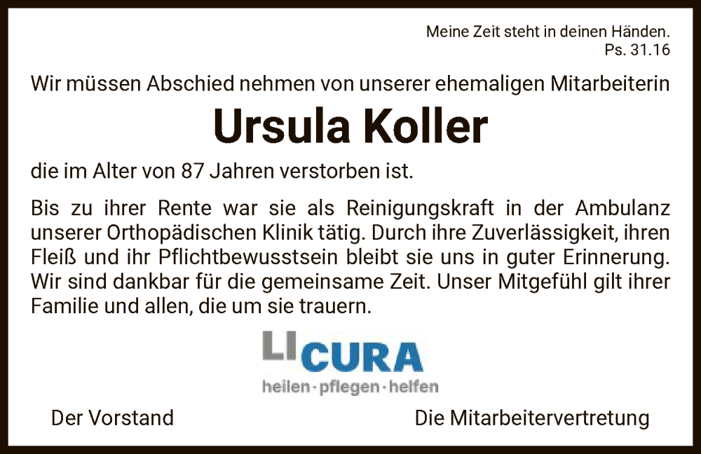 Hier finden Sie alle Traueranzeigen aus der Zeitung, die bisher für Ursula Koller erschienen sind. Weitere Traueranzeigen, die in der Zeitung erscheinen, werden hier ebenfalls aufgelistet