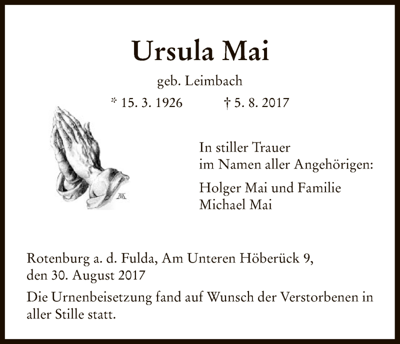 Hier finden Sie alle Traueranzeigen aus der Zeitung, die bisher für Ursula Mai erschienen sind. Weitere Traueranzeigen, die in der Zeitung erscheinen, werden hier ebenfalls aufgelistet