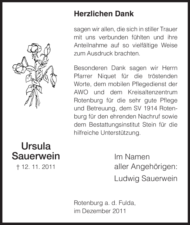 Hier finden Sie alle Traueranzeigen aus der Zeitung, die bisher für Ursula Sauerwein erschienen sind. Weitere Traueranzeigen, die in der Zeitung erscheinen, werden hier ebenfalls aufgelistet