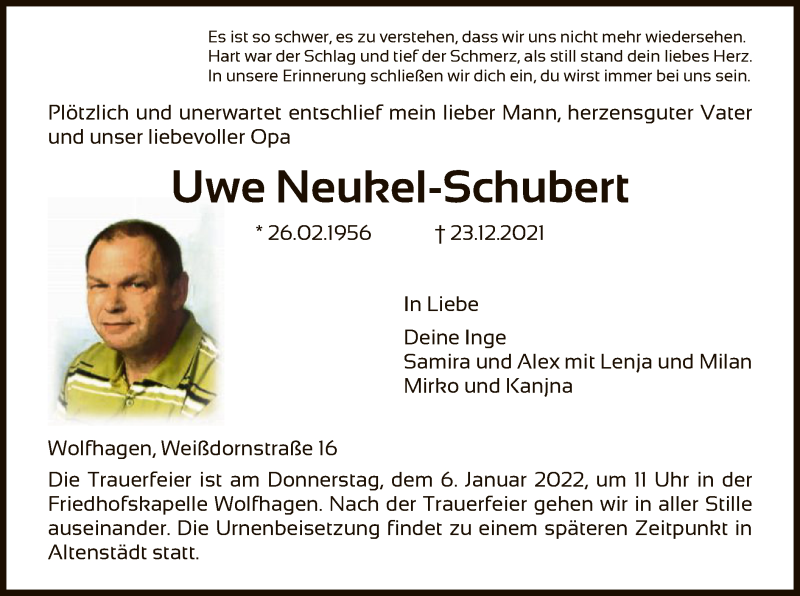 Hier finden Sie alle Traueranzeigen aus der Zeitung, die bisher für Uwe Neukiel-Schubert erschienen sind. Weitere Traueranzeigen, die in der Zeitung erscheinen, werden hier ebenfalls aufgelistet