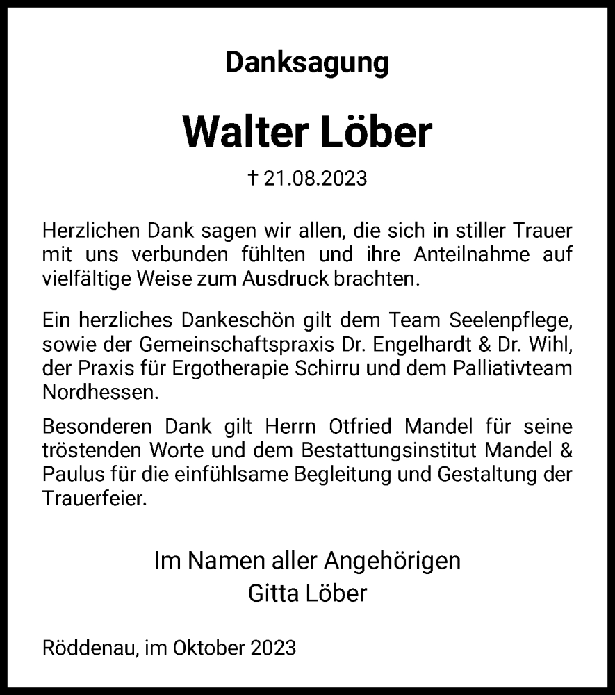 Hier finden Sie alle Traueranzeigen aus der Zeitung, die bisher für Walter Löber erschienen sind. Weitere Traueranzeigen, die in der Zeitung erscheinen, werden hier ebenfalls aufgelistet