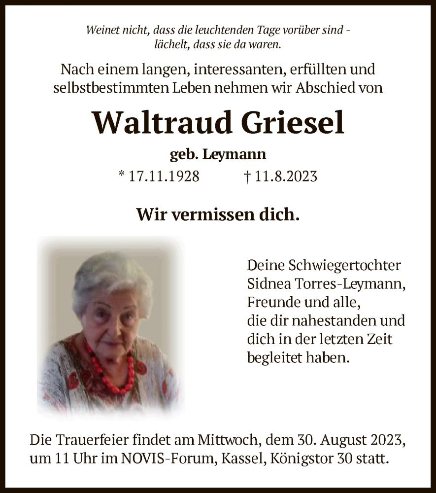 Hier finden Sie alle Traueranzeigen aus der Zeitung, die bisher für Waltraud Griesel erschienen sind. Weitere Traueranzeigen, die in der Zeitung erscheinen, werden hier ebenfalls aufgelistet