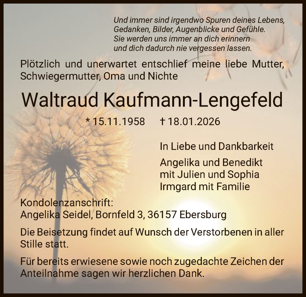 Hier finden Sie alle Traueranzeigen aus der Zeitung, die bisher für Waltraud Kaufmann-Lengefeld erschienen sind. Weitere Traueranzeigen, die in der Zeitung erscheinen, werden hier ebenfalls aufgelistet