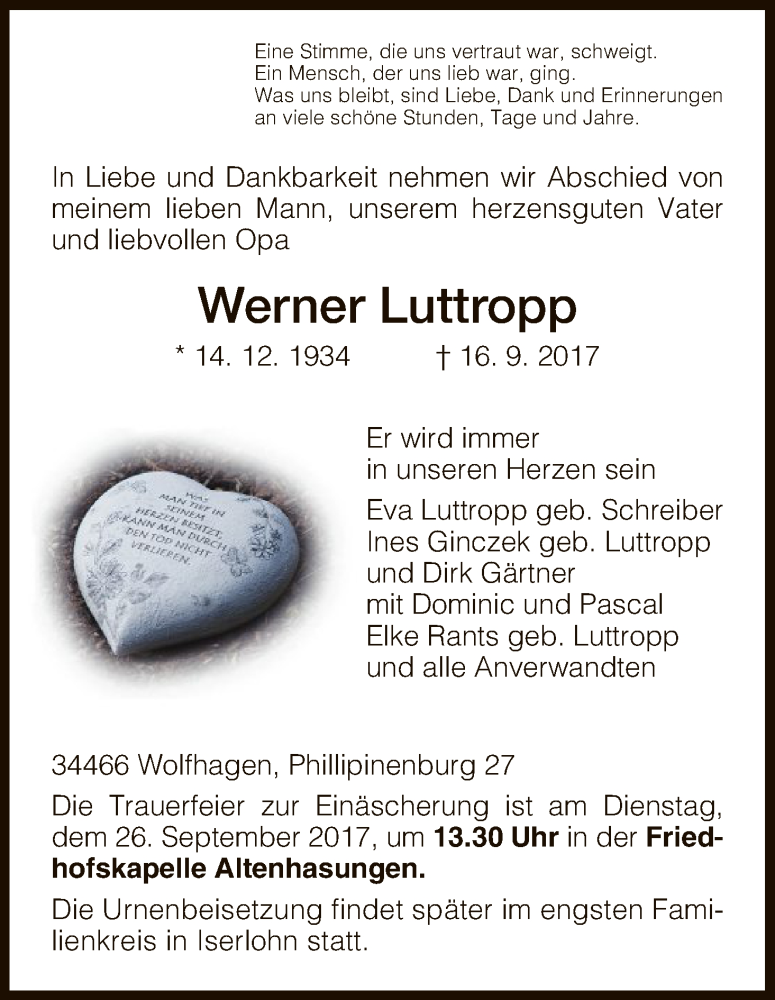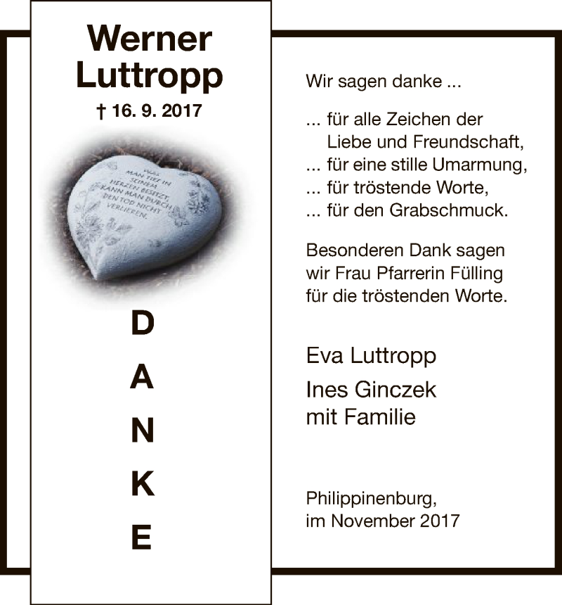 Hier finden Sie alle Traueranzeigen aus der Zeitung, die bisher für Werner Luttropp erschienen sind. Weitere Traueranzeigen, die in der Zeitung erscheinen, werden hier ebenfalls aufgelistet