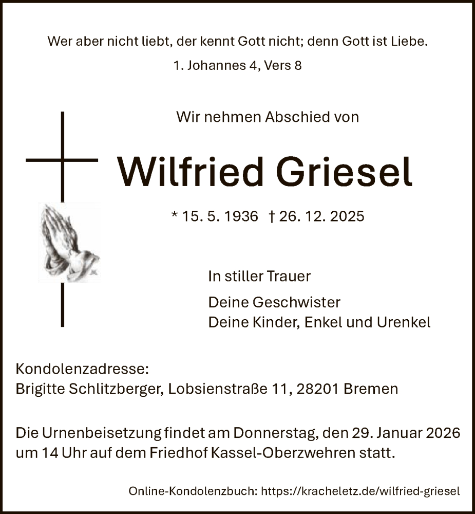 Hier finden Sie alle Traueranzeigen aus der Zeitung, die bisher für Wilfried Griesel erschienen sind. Weitere Traueranzeigen, die in der Zeitung erscheinen, werden hier ebenfalls aufgelistet