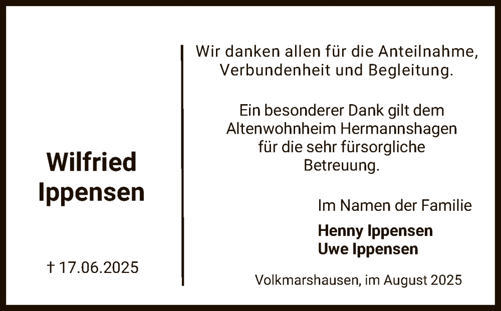 Hier finden Sie alle Traueranzeigen aus der Zeitung, die bisher für Wilfried Ippensen erschienen sind. Weitere Traueranzeigen, die in der Zeitung erscheinen, werden hier ebenfalls aufgelistet