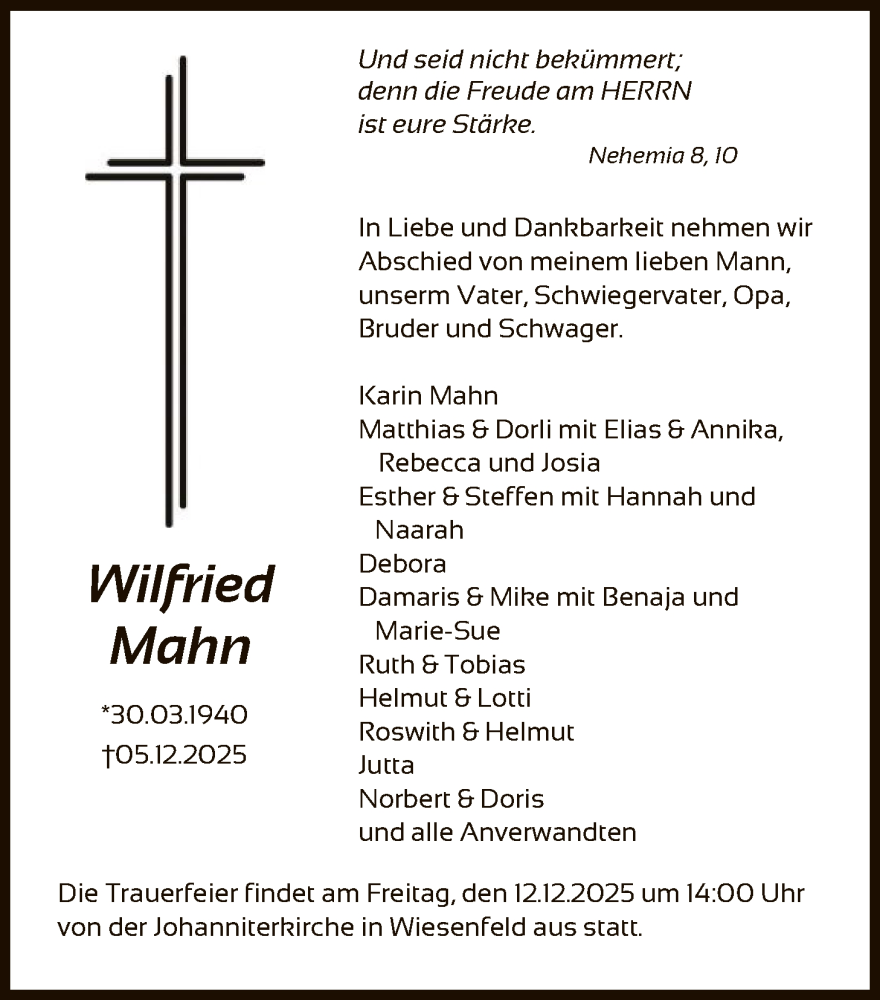 Hier finden Sie alle Traueranzeigen aus der Zeitung, die bisher für Wilfried Mahn erschienen sind. Weitere Traueranzeigen, die in der Zeitung erscheinen, werden hier ebenfalls aufgelistet