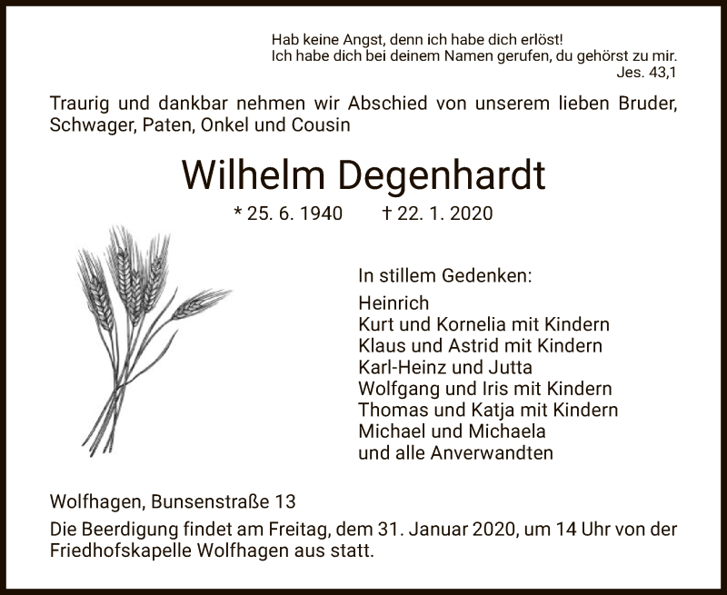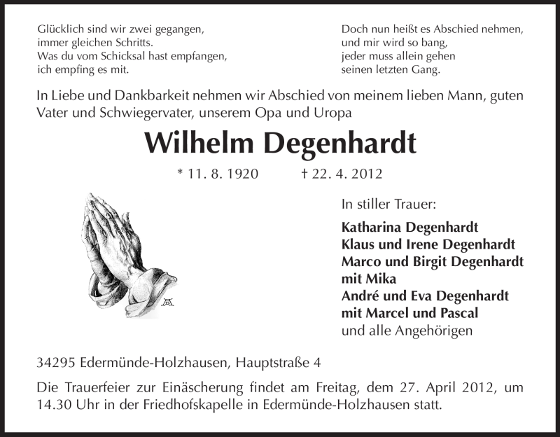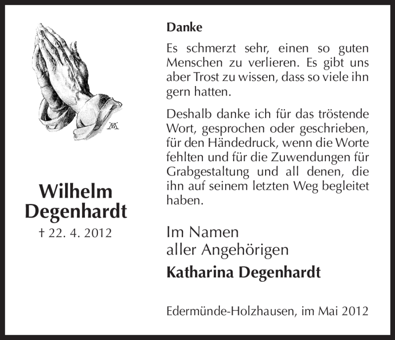 Hier finden Sie alle Traueranzeigen aus der Zeitung, die bisher für Wilhelm Degenhardt erschienen sind. Weitere Traueranzeigen, die in der Zeitung erscheinen, werden hier ebenfalls aufgelistet