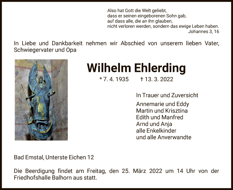 Hier finden Sie alle Traueranzeigen aus der Zeitung, die bisher für Wilhelm Ehlerding erschienen sind. Weitere Traueranzeigen, die in der Zeitung erscheinen, werden hier ebenfalls aufgelistet