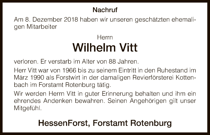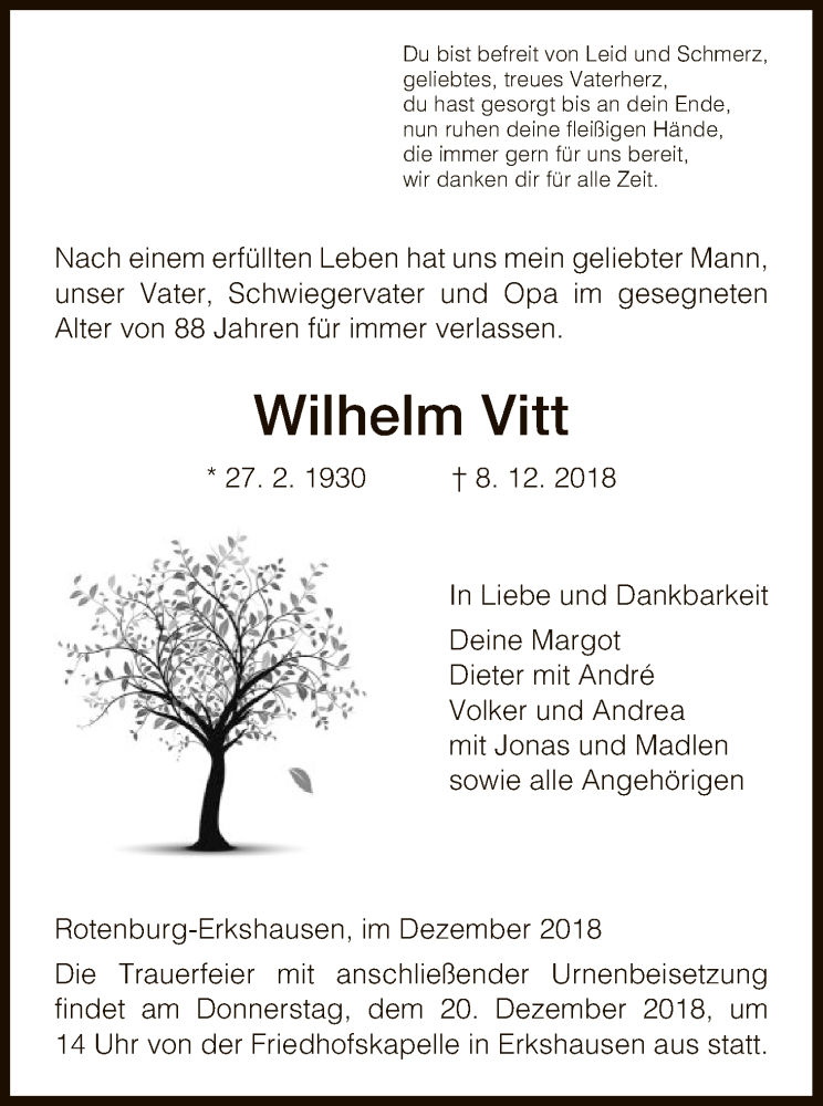 Hier finden Sie alle Traueranzeigen aus der Zeitung, die bisher für Wilhelm Vitt erschienen sind. Weitere Traueranzeigen, die in der Zeitung erscheinen, werden hier ebenfalls aufgelistet