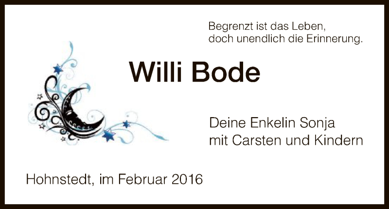 Hier finden Sie alle Traueranzeigen aus der Zeitung, die bisher für Willi Bode erschienen sind. Weitere Traueranzeigen, die in der Zeitung erscheinen, werden hier ebenfalls aufgelistet
